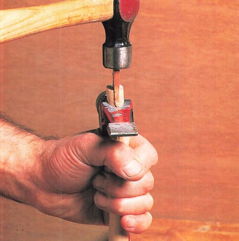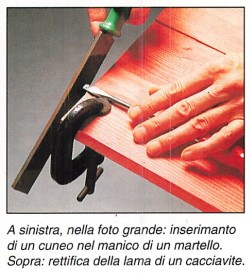 Devono essere sempre tenuti puliti e la loro bocca deve essere esente da rigature o irregolarità. Quando esponete l’utensile a prodotti diversi (in particolare la colla), pulitelo poi con cura. Infatti, una bocca di martello pulita rischia meno di scivolare. Quando osservate delle piccole irregolarità, passatela con la tela smeriglio. Verificate in particolare il manico dei martelli, almeno per gli utensili con manico in legno. Se notate del gioco, tenete il martello verticale con il manico in basso, e colpite su una superficie solida. Per rinforzarlo, potrete utilizzare dei piccoli cunei di legno duro da inserire tra il manico e la massa battente (esistono anche cunei metallici speciali per bloccare il manico degli utensili). Quando il manico è rovinato, deve essere sostituito; utilizzate un nuovo manico che abbia esattamente la stessa lunghezza (calcolata in funzione del peso del massello). A volte è difficile togliere il manico, per cui la cosa più semplice consiste nel tagliarlo sotto il massello e nel togliere il moncone bloccando la massa battente nella morsa. Per rimettere a posto il nuovo manico, è spesso necessario adattarlo al foro mediante una raspa e la carta vetrata. Con la sega a dorso, eseguite due intagli nell’estremità per poter fare penetrare i cunei di bloccaggio.