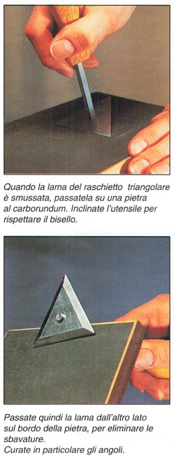 Il raschietto triangolare presenta una lama in acciaio temprato affilata, come del resto i vari raschietti a losanga o ogivali. Questo utensile è generalmente sottoposto a degli sforzi notevoli, quando si sverniciano i piani o si allargano le fessure nei muri. Per conservare la sua efficacia, occorre però che i suoi bordi rimangano taglienti. Dopo ogni utilizzo, pulite l’utensile, spesso utilizzato per dei lavori che richiedono l’uso di prodotti vari, per cui il suo metallo può essere attaccato da agenti chimici. La manutenzione del ferro consiste nel passare la lama su una pietra al carborundum prima da un lato, inclinando l’utensile, e poi dall’altro sul bordo della pietra.