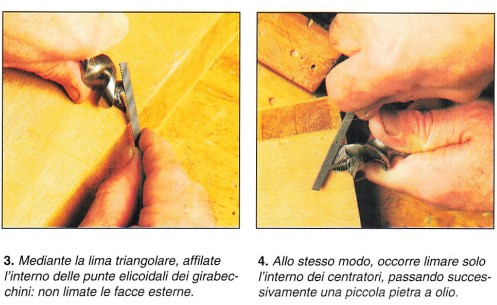 Si affilano anche a mano le punte elicoidali dei girabecchini. Utilizzate la lima triangolare limando secondo l’angolo originale, affilando l’interno ma non l’esterno, perché la punta risulterebbe disassata. In generale, qualche colpo di lima piuttosto leggero è sufficiente per ridare l’efficacia originale ad una mecchia, non insistete troppo, perché rischiereste di rovinarla.
