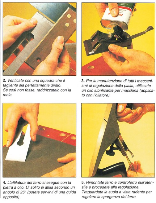 La pialla è un utensile di precisione, che va riposto al riparo dall’umidità. La manutenzione riguarda soprattutto l’affilatura. Potrebbe anche essere necessario rettificare il ferro con la mola quando è sbrecciato. Occorre anche applicare olio sui filetti delle viti di regolazione delle pialle metalliche. Prima di qualsiasi utilizzo, dovrete verificare la regolazione dello strumento. Inoltre, può essere necessario ripassare la suola metallica che deve rimanere perfettamente liscia, sfregando con una mistura di sabbia fine e olio di macchina o con della lana d’acciaio.