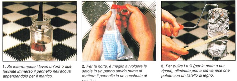 I pennelli e i rulli sono particolarmente delicati: se sono tenuti male, le setole possono deformarsi o incrostarsi e il materiale sintetico di cui sono fatti i rulli può deteriorarsi o sporcarsi.