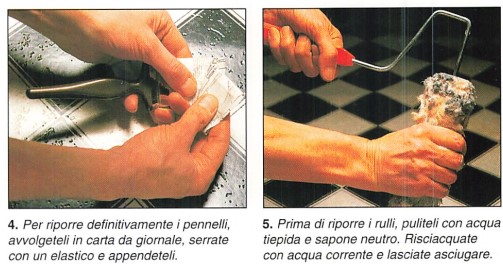 Se avete utilizzato uno smalto o una vernice non solubile nell’acqua, mettete il pennello nel solvente, dopo avere eliminato più vernice possibile con una rada. Pulite al massimo, sfregando le setole con un panno. Quindi, immergete il pennello nell’acqua piuttosto calda con un detersivo neutro. Pulite a fondo prima di risciacquare con acqua corrente. Una volta terminati i lavori di verniciatura, potete riporre i pennelli avvolgendoli in carta da giornale, premendo prima le setole su un panno per ammorbidirle e togliere l’umidità; lisciatele e avvolgetele in vari strati di giornale, che terrete fermi mediante un elastico di gomma. Non avvolgete mai i pennelli nella plastica, se non per poco tempo, perché la condensa li deteriora rapidamente e fa arrugginire la ghiera. È spesso difficile eliminare completamente i pigmenti di colore nello spessore delle setole; ecco perché è prudente riservare dei pennelli speciali per il bianco, o anche per i colori chiari.