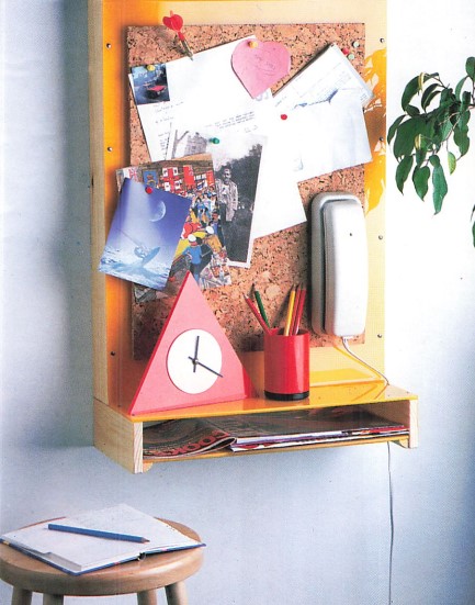 Il portaoggetti pensile può essere utilizzato in un ingresso per sistemare il telefono a parete. In questo caso, si fissa tramite pastiglie adesive un pannello di agglomerato di sughero piuttosto spesso. che consentirà di puntare per esempio dei foglietti (potete anche sistemare uno specchio).