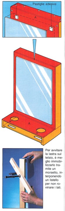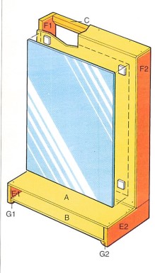 Questo telaio è fabbricato con listelli e tavole di legno, per esempio di pino, assemblati tramite incollatura e rinforzati con spine. Per la foratura, dovrete munirvi quindi di una guida per spinare. A seconda dei casi, il mobile sarà dotato di uno specchio (nel bagno) o di un pannello di sughero. fissati entrambi con pastiglie adesive. Potrete inoltre prevedere diverse sistemazioni per una lampada, i bicchieri per gli spazzolini o il telefono a parete.