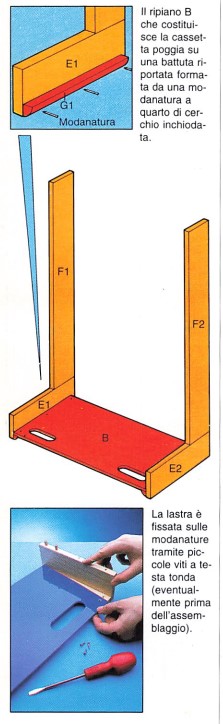 Quando la colla si è essiccata, fissate la lastra della cassetta sul telaio. Realizzate delle battute riportate inchiodando modanature a quarto di cerchio tramite chiodini fini. La lastra viene quindi avvitata.