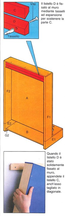 Il sistema di fissaggio è molto semplice, perché è costituito da due listelli con un bordo bisellato. Fissate bene D nel muro, utilizzando tasselli adatti al supporto. C è avvitato sulla lastra.