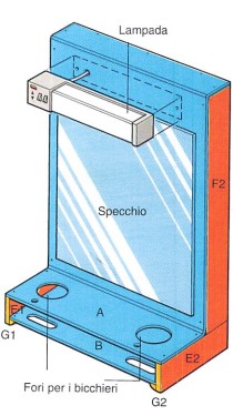 La struttura del mobiletto é la stessa; dovrete solo forare il ripiano per i bicchieri (55 mm) e per gli spazzolini (12 mm). Lo specchio è fissato tramite pastiglie adesive e la lampada è avvitata.