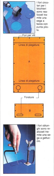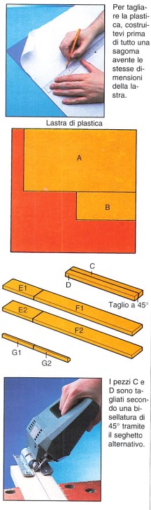 Prima di piegare la lastra di plastica. praticate i fori per le viti con il trapano. Effettuate la foratura e il taglio con la sega mettendo la lastra su una tavola e immobilizzandola con un morsetto.