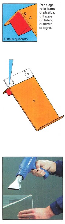 La piegatura della lastra di plastica viene eseguita con una pistola termica. Dovrete riscaldare le due facce spostando l’ugello per non bruciare il materiale. Realizzate la piegatura su un listello quadrato di legno.