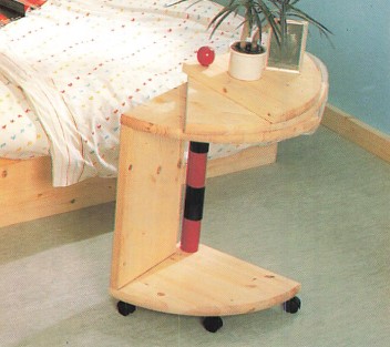 L’originalità di questi comodini sta nei loro piani sovrapponibili che ruotano attorno ad un asse per aumentare o ridurre la superficie utilizzabile. Sono ricavati da un pannello di abete circolare di 80 cm di diametro: tre quarti del cerchio servono a formare i livelli superiori, mentre il quarto costituisce la base nella quale sono fissate le rotelle. I livelli superiore ed inferiore sono collegati tramite un unico montante (anch’esso in abete) e una barra rotonda in cui è alloggiata un’asta filettata che serve da asse di rotazione.