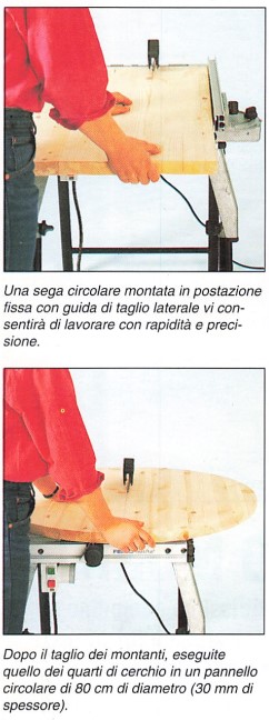 Quest’ultimo sarà tagliato in due per poter realizzare il montante di ogni tavolino. Ogni pannello circolare è tagliato in quarti per formare i piani e la base, i cui raggi misurano quindi 40 cm. La differenza di 10 cm tra la larghezza del montante e quella del quarti di cerchio lascerà uno spazio sufficiente per inserire una barra rotonda la cui altezza sarà uguale a quella del montante (60 cm).