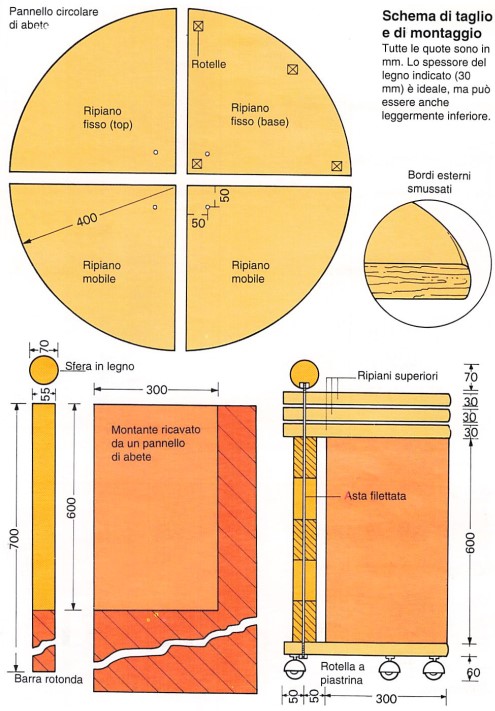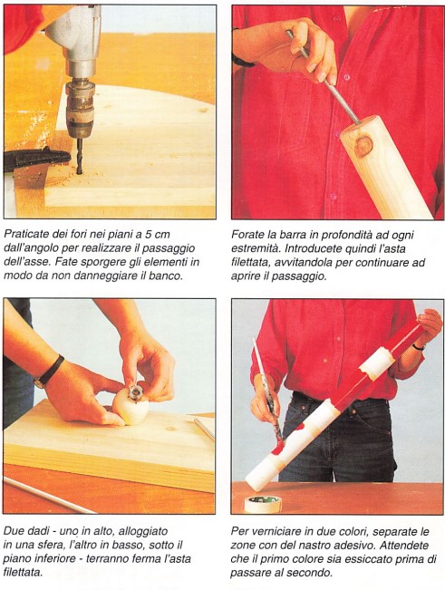 La struttura del mobile è caratterizzata dall’asse attorno al quale è possibile sviluppare la superficie del tavolino, o al contrario far scorrere i piani gli uni sugli altri. Questo asse è infatti costituito da una semplice asta filettata che si inserisce attraverso i tre ripiani superiori. Apparentemente semplice, questa soluzione nasconde tuttavia un trucco: per tenere ferma questa asta filettata (che acquisterete nelle dimensioni standard, ma che taglierete nella lunghezza desiderata) e allo stesso tempo per nasconderla, la inserirete in una barra rotonda da un’estremità all’altra. Si tratta di un’operazione piuttosto delicata, che potrete eseguire dopo avere praticato un foro ad ogni estremità della barra il più profondo possibile. Il resto dell’alloggiamento è eseguito dall’asta stessa, che si inserisce a poco a poco tramite awitamento e con infinite precauzioni per procedere ben diritti da un’estremità all’altra. Una volta posizionata l’asta nella sua guaina, viene serrata tramite un dado sotto il piano inferiore; una sfera di legno anch’essa dotata di un dado la sormonterà sopra i piani superiori. Questi ultimi, forati per consentire il passaggio dell’asse, possono a questo punto scorrere liberamente attorno a questo asse invisibile.